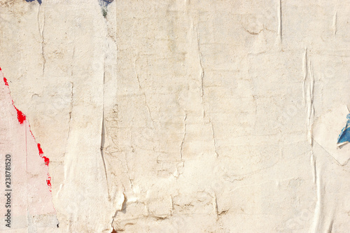Old grunge ripped torn vintage collage street posters creased crumpled paper surface placard texture background backdrop empty space for text