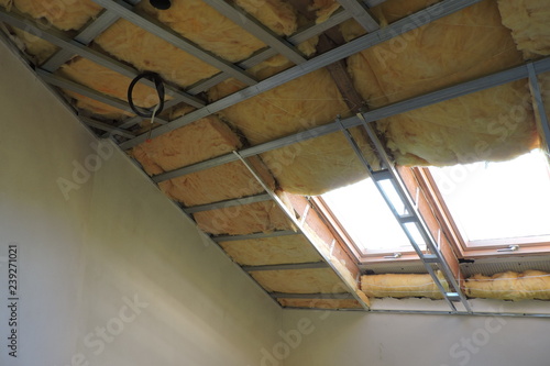 A room with a metal frame of a ceiling under construction insulated with mineral wool