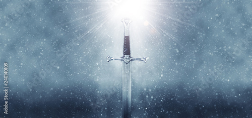 mysterious and magical photo of silver sword over gothic snowy black background. Medieval period concept.