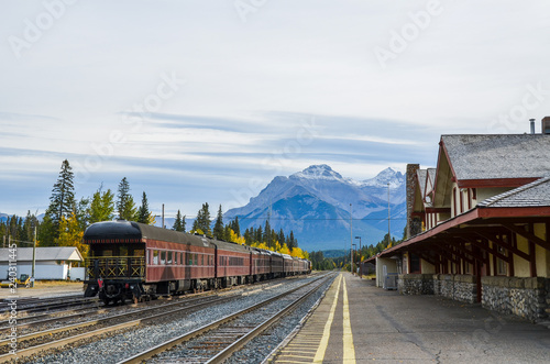 秋のカナディアンロッキー 黄葉のバンフ駅に停まる旧式の列車とカスケード山(バンフ国立公園 カナダ・アルバータ州)