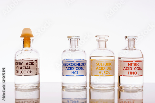 The three common inorganic acids and the most common organic acid used in chemistry: hydrochloric, sulfuric, nitric and acetic.