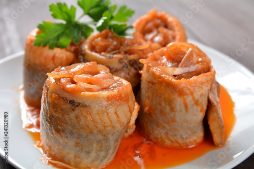 marynowane filety śledziowe z sosem pomidorowym i cebulą