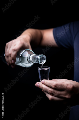 Czysta wódka. Mężczyzna nalewa alkohol do kieliszka.