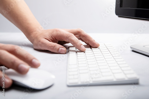 Praca w biurze. Mężczyzna pracuje na komputerze.