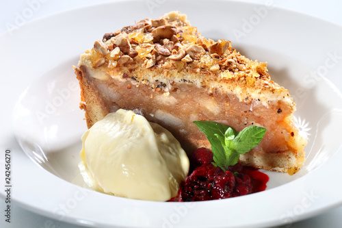 Domowa szarlotka z bitą śmietaną i malinami.
