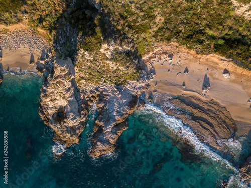 Vista aerea di Capo Vaticano, Calabria, Italia. Ricadi. Costa degli Dei. Promontorio della costa calabra. Costa frastagliata, insenature spiagge e calette. Tramonto