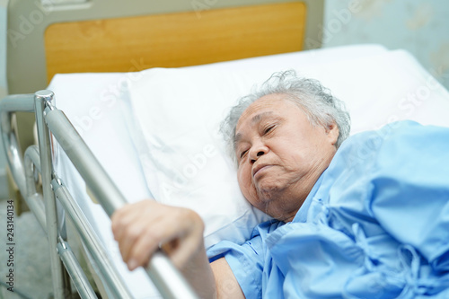 Asian senior or elderly old woman patient lie down handle the rail bed with hope on a bed in the hospital.