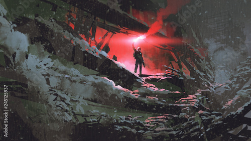 apocalypse world concept showing the man holding a red smoke flare in the destroyed building, digital art style, illustration painting