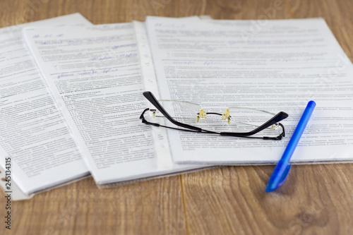 office tedious labor: Several contracts for the reading and signing are on the table, placed on top of glasses and a pen, in short focus