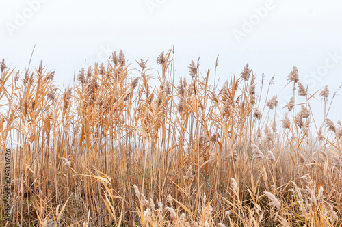 Reeds yellow and dry in the mist of an autumn day, panorama