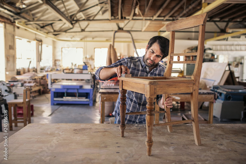 Furniture maker sanding a chair on workshop bench