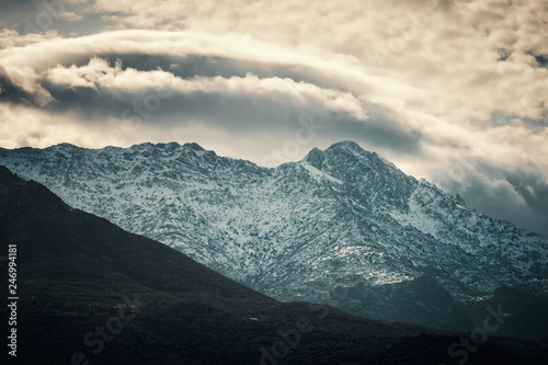 Snow capped peak of Monte Grosso mountain in Corsica