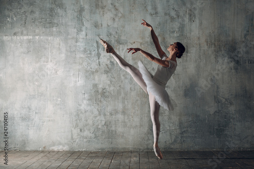 Ballerina female. Young beautiful woman ballet dancer, dressed in professional outfit, pointe shoes and white tutu.