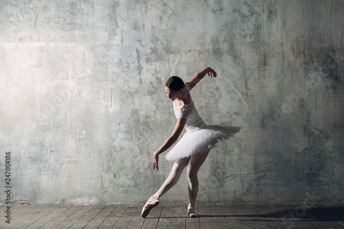 Ballerina female. Young beautiful woman ballet dancer, dressed in professional outfit, pointe shoes and white tutu.