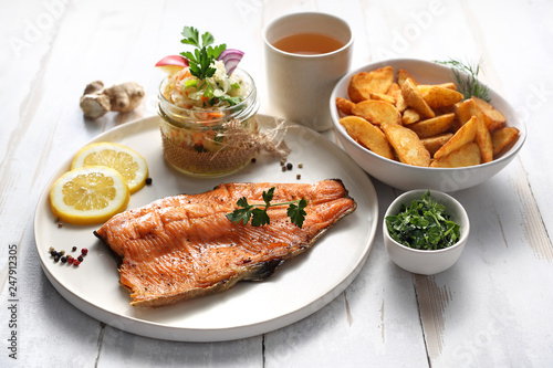 Smażony filet z pstrąga podany z surówką i pieczonymi ziemniakami.