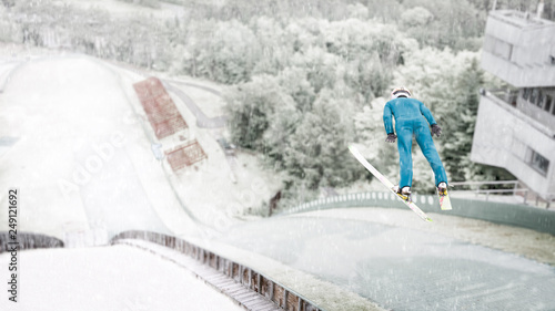 Ski jumper flying through the air during a practice session at the Lake Placid, NY, ski jumps