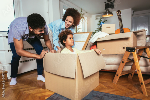 African American family, parents and daughter, unpacking boxes and moving into a new home, having fun.