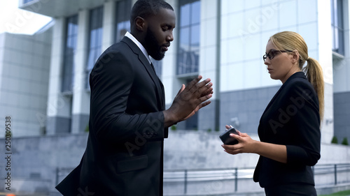 Man apologizing to lady employee for attempt of pick up, business relationship
