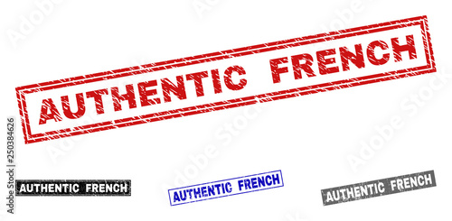 Grunge AUTHENTIC FRENCH rectangle stamp seals isolated on a white background. Rectangular seals with grunge texture in red, blue, black and grey colors.