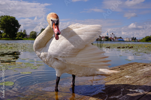 Beautiful big swan on the pond of the small town of Pastavy in Belarus against the backdrop of an ancient Orthodox church