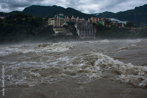 paisaje de la fuerza del río Ganges junto a las montañas en India, copy-space