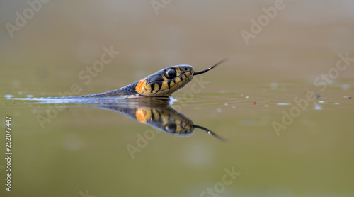 Adult Grass snake swims in green waters while hunting with sticking his tongue out to gather scents of prey