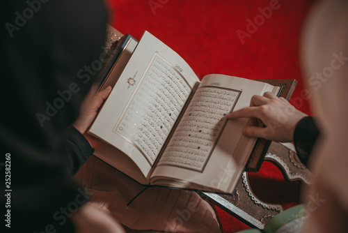 Three muslim girls reading Quran in mosque