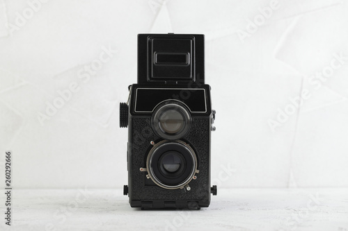The old medium format film TLR camera, camera for modern lomography on white cement background.
