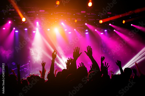 People, crowd on concert. Purple light from stage.