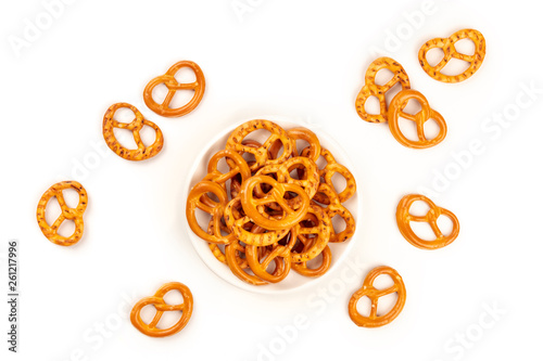 Salt pretzels, shot from the top on a white background with copy space. Party snacks with a place for text