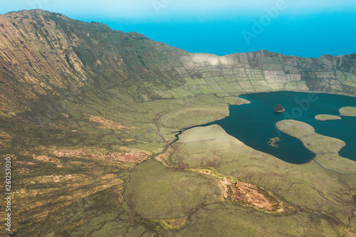 Aerial view of volcanic crater (Caldeirao) with a beautiful lake on the top of Corvo island. Azores islands, Portugal.