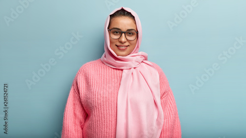 Half length shot of beautiful dark eyed smiling female in pink jumper and hijab, looks through spectacles, happy to hear good news, follows Muslim religion and rules, has satisfied gaze in camera