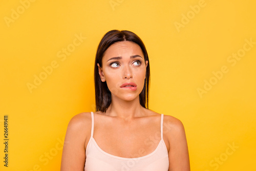 Close up photo beautiful she her lady look empty space fear hide eyes bite lip bad wrong unsuitable situation feel guilty wear casual pastel tank-top outfit clothes isolated yellow bright background