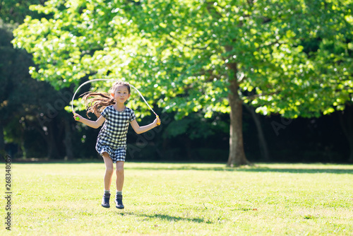 芝生で縄跳びをする女の子