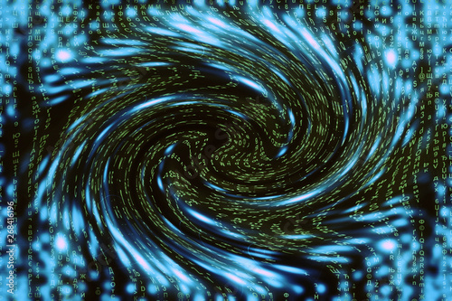 Blue green matrix digital background. Distorted cyberspace concept. Green characters fall down in wormhole. Hacked matrix. Virtual reality design. Complex algorithm data hacking. Cyan digital sparks.
