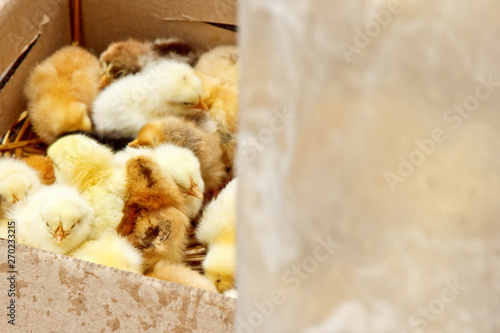 yellow and black little broiler chickens with down on the body sit in a cardboard box close-up top view. newborn chicks