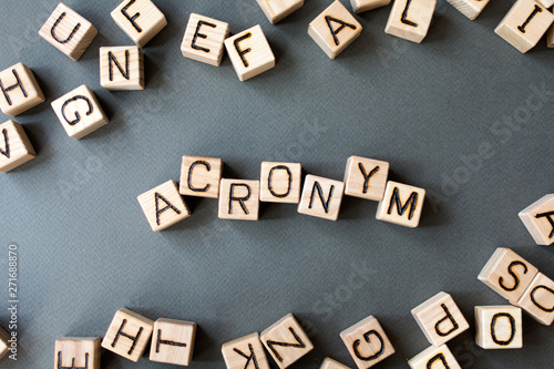 the word acronym wooden cubes with burnt letters, use of acronyms in the modern world, gray background top view, scattered cubes around random letters