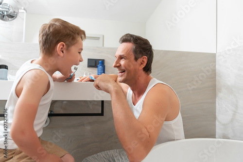 Happy dad and son doing morning procedure together