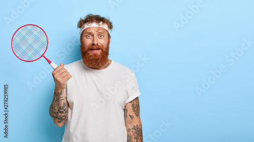 Horizontal shot of puzzled redhead man poses with tennis racket, being worn out of active game, wears casual clothes, poses over blue wall with empty space. Fatigue sportsman plays on tennis court