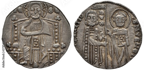 Venice Venetian silver coin grosso 14th century, ruler Doge Giovanny Soranzo, figure with nimbus on throne, standing doge receives blessing from God,