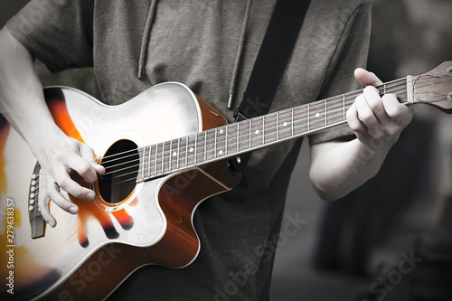A professional musician plays an improvised melody on a six-string acoustic beautiful guitar, holding a mediator in his hand. Photo in black and white to highlight the brightness of the music