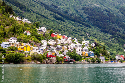 Colorful norwegian residential houses on the hill of Sorfjord, Odda, Hordaland county, Norway