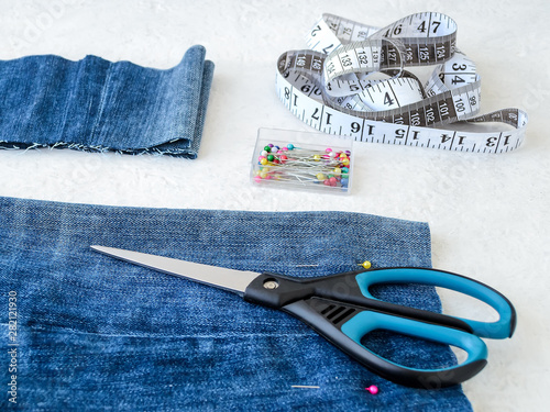Making shorts out of blue jeans with multi colored headed sewing pins, white tailor tape with centimeters and inches and scissors. Shorten the jeans. DIY shorts out of jeans.