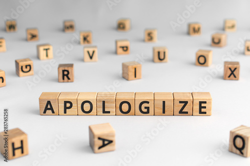 apologize - word from wooden blocks with letters, sorry concept, random letters around, white background