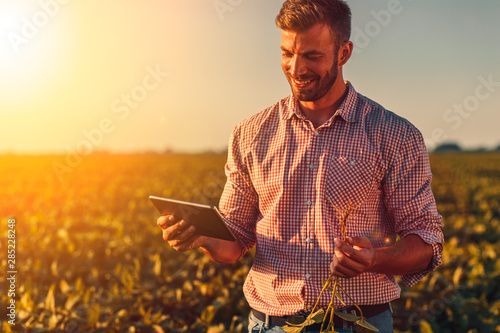 Farmer standing in soybean field looking at tablet at sunset.
