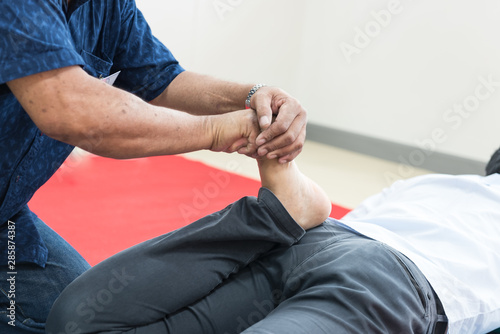 Young working man lying down while enjoying the stretching foot and leg techniques of a professional Thai massage in the spa and wellness center. physical therapy.Muscular treatment office syndrome.