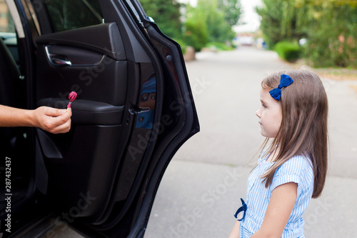 Stranger in the car offers candy to the child. Kids in danger. Children safety protection kidnapping concept