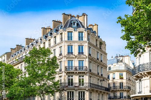 Paris, typical building, parisian facade wall and windows boulevard de Sebastopol