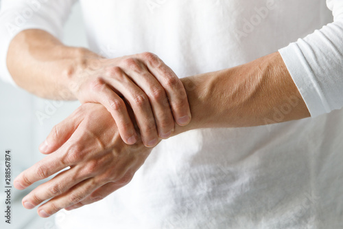 Closeup of male arms holding her painful wrist caused by prolonged work on the computer, laptop. Carpal tunnel syndrome, arthritis, neurological disease concept. Numbness of the hand