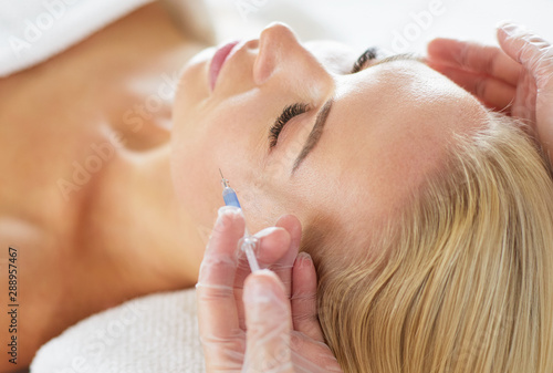 Beautiful woman gets beauty facial injections. Face aging injection. Aesthetic Cosmetology